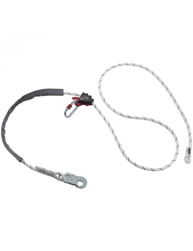 Rope adjuster wykonany jest z 12,5 mm liny statycznej, po której przesuwa się przyrząd zaciskowy pozwalający na regulację długości lonży do 2 metrów. Czerwona przesuwna taśma chroni linę przed przetarciem.