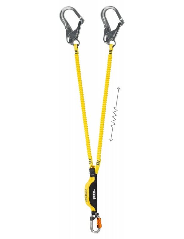 ABSORBICA-Y MGO to podwójna lonża ze zwartym absorberem energii, przeznaczona do autoasekuracji z przepinaniem się na konstrukcji pionowej lub poziomej poręczówce