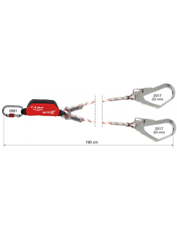 Lonża typu Y wyposażona w nowy absorber energii Retexo i dwa ramiona wykonane z liny zakończone karabinkami typu MGO o dużym prześwicie. W komplecie owalny karabinek stalowy do łączenia z szelkami bezpieczeństwa/uprzężą. Lonża wraz z karabinkami ma długość 190 cm.