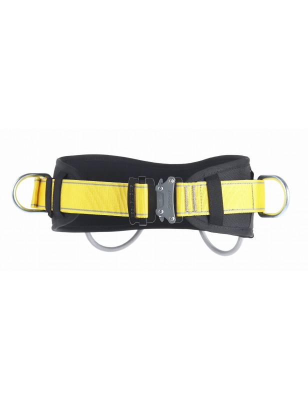 - Umieszczone po obu stronach pasa D–ringi służą do pozycjonowania roboczego w podparciu, zgodnie z normą EN 358, testowane obciążeniem 15 kN.