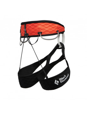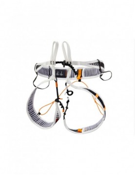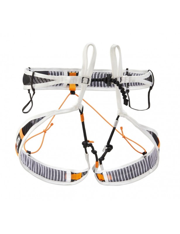 - innowacyjna konstrukcja bez klamer (patent Petzl). Rolę klamry na pasie przejmuje ściągacz, a taśmy udowe są regulowane przy pomocy węzła główka skowronka