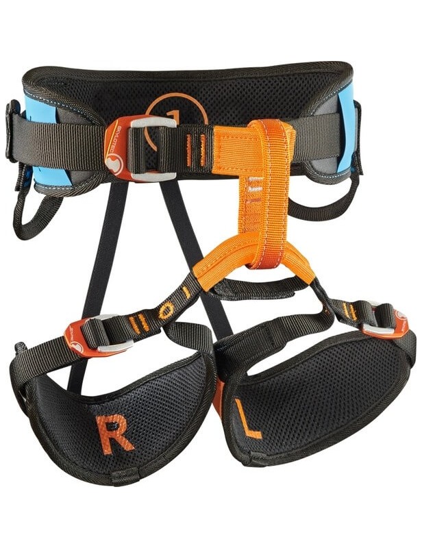 Dobry design nie polega tylko na tym, że coś „ładnie” wygląda - musi być też funkcjonalne! Ponieważ Sunstone przewidziany jest jako uprząż do wypożyczeń, pas biodrowy każdego rozmiaru wykonany został w innym kolorze, znacznie ułatwiając szybki wybór odpowiedniej wersji. Rozróżnienie kolorystyczne idzie tutaj jednak znacznie dalej - pętle udowe też są wykonane w kontrastowych kolorach, uzupełnionych dodatkowo o oznaczenia „R” i „L”. Przy takiej dbałości o detale łącznik, który został wykonany w kontrastowym, pomarańczowym kolorze, jest właściwie formalnością.