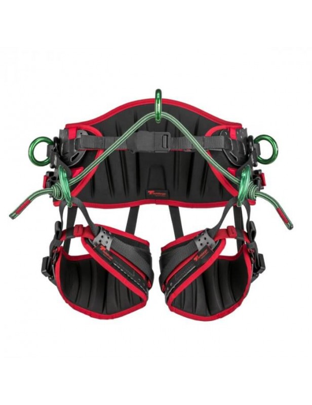 treeMOTION PRO może pochwalić się otwieranymi ringami przy bocznych punktach wpięcia. Tego typu konstrukcja pozwala na znacznie łatwiejszą regulację taśm łączących pętle udowe z pasem biodrowym. Umożliwia to również ewentualną wymianę ringów, tym samym przedłużając użycie uprzęży.