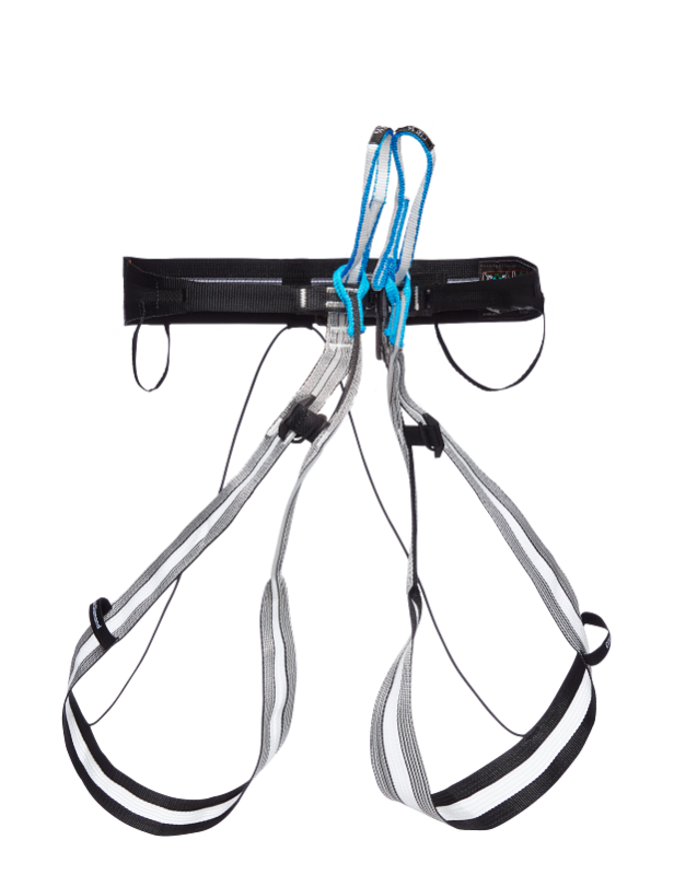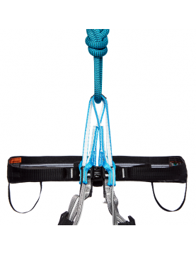 - Kolorowe szlufki w pasie i na nogach (wewnątrz/zewnątrz) ułatwiają zakładanie uprzęży