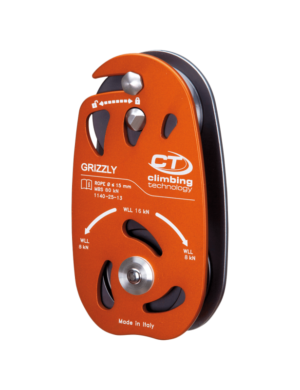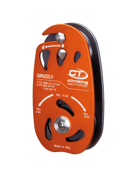 Grizzly jest przykładem myśli innowacyjnej Climbing Technology – przemyślany w najdrobniejszym szczególe, wykonany przy pomocy nowoczesnych technologii z najlepszych jakościowo materiałów. Okładki bloczka wykonane są z grubego i wytrzymałego aluminium, co pozwoliło nieco zaoszczędzić na wadze tego i tak sporego bloczka, a osie wykonano ze stali nierdzewnej dla największej możliwej wytrzymałości. CT w swoim bloczku dla arborystów zastosowało tuleje samosmarujące, które co prawda charakteryzują się mniejszą wydajnością niż łożyska kulkowe, jednak są dużo bardziej wytrzymałe na udary. Ruchoma okładka otwiera się pod kątem ponad 90 stopni dzięki czemu łatwiej jest wprowadzić linę. Grizzly współpracuje z linami o średnicach do 15mm.