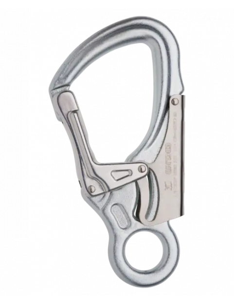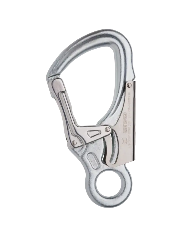 Wytrzymały stalowy karabinek z mechanizmem ściskania dłoni do użytku w systemach PPE.