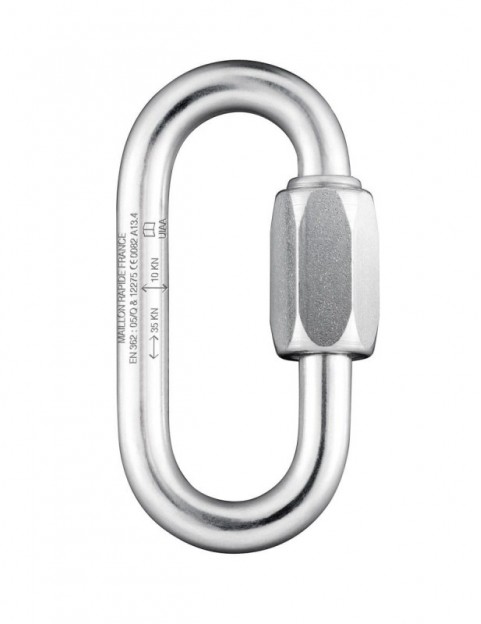 Łącznik owalny z certyfikacją CE. Zgodny z EN 362 i EN 12275. Średnica: 8 mm Długość: 74 mm Szerokość: 34 mm Wytrzymałość na zerwanie: 35 kN Materiał: stal ocynkowana