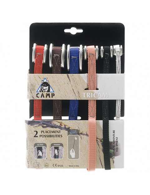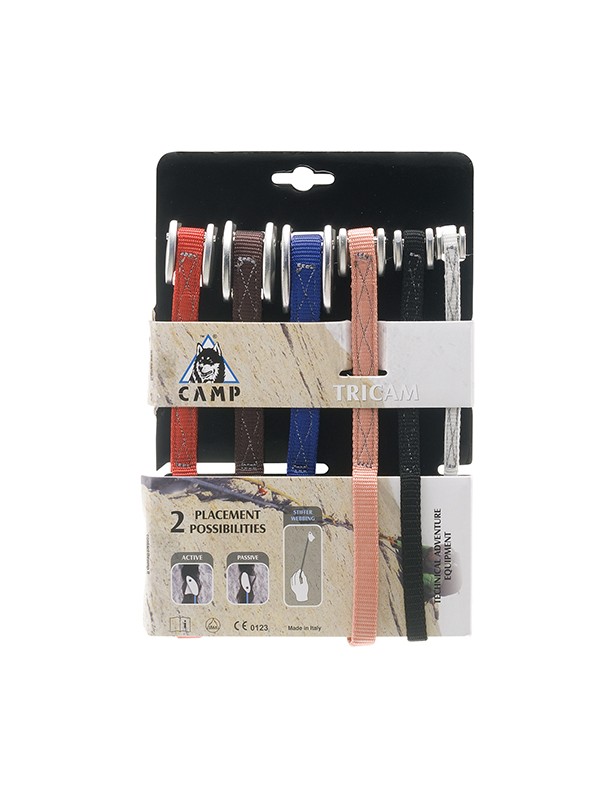 Tricamy doskonale sprawdzają się tam gdzie inny sprzęt zawodzi - np. w poziomych rysach lub hakodziurach. Zestaw składa się z sześciu kości w rozmiarach 0.125, 0.25, 0.5, 1.0, 1.5, 2.0. Rozmiary oznaczone są kolorowymi taśmami. Zestaw dostępny również w wersji z taśmami z Dyneemy.
