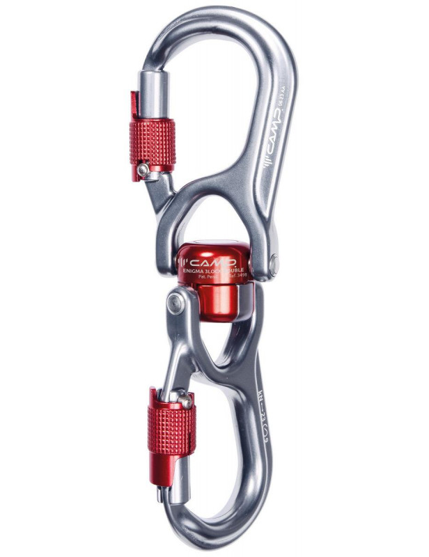 Enigma 3Lock Double integruje dwa karabinki z potrójną blokadą i krętlik w jednym urządzeniu, zapewniając szybkie i kompaktowe połączenia, które można zarówno obracać, jak i przechylać.