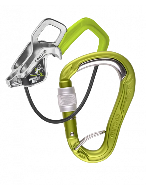 Zestaw asekuracyjny składający się z przyrządu asekuracyjnego MEGA JUL II i karabinka HMS BULLETPROOF SCREW FG.