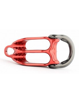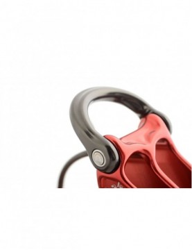 Co jest drugą najważniejszą zaletą (po uszku stanowiskowym) górskiego przyrządu asekuracyjnego? Oczywiście, przednie oczko przeznaczone do wpięcia karabinka i wygodniejszego odblokowywania kubka! Wiele przyrządów cierpi z powodu źle zaprojektowanych otworów, przez które nie da się przełożyć części dostępnych na rynku karabinków. Pivota to nie dotyczy - oczko jest na tyle duże, że spokojnie zamontujemy w nich duże HMSy, takie jak Boa, karabinki z zamkiem typu Clean Nose (jak np. Alpha Trady) czy też karabinki D-kształtne lub owale.