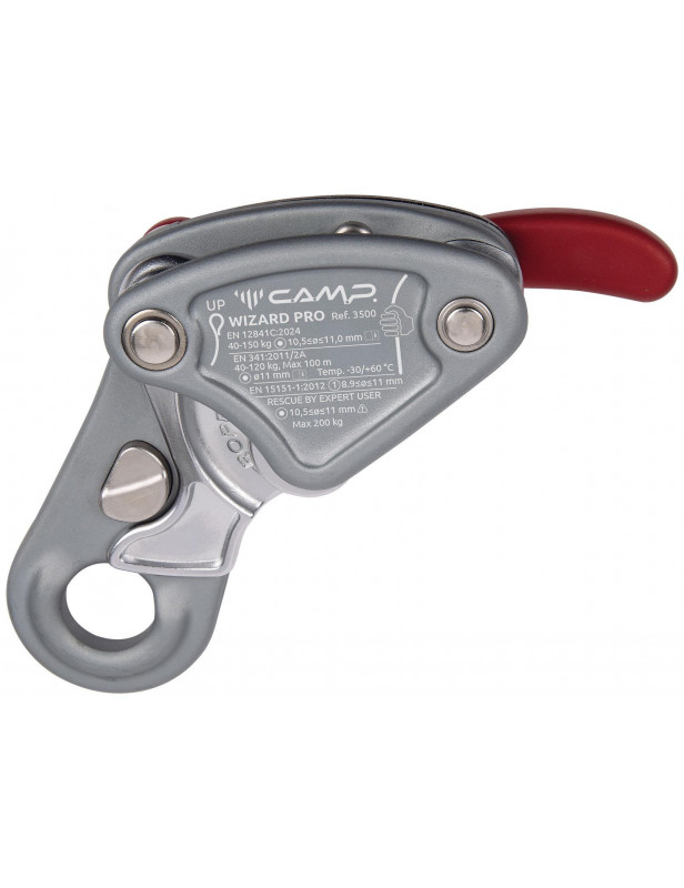Posiada przycisk, który umożliwia przytrzymanie krzywki otwartej, aby ułatwić wkładanie liny i pozostać połączonym z użytkownikiem, gdy jest otwarta w czasie, gdy lina jest wkładana lub wyjmowana. Jest wyposażony w funkcję antypaniczną w dźwigni, która ponownie włącza krzywkę i blokuje linę, jeśli uchwyt zostanie pociągnięty zbyt daleko, co może prowadzić do niebezpiecznych prędkości zjazdu. Dźwignia automatycznie wraca do pozycji LOCK po zwolnieniu. Wizard zapewnia niezwykłą sterowność dzięki sprawdzonemu wewnętrznemu mechanizmowi i sztywnej dźwigni wykonanej z wytrzymałego, kutego na gorąco stopu aluminium.