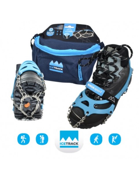 Elastyczne raczki na buty. Stalowe zęby poddane obróbce termicznej oraz łańcuch ze stali nierdzewnej zapewniają bardzo dobrą przyczepność do podłoża. Wystarczy założyć je na podeszwę i zaciągnąć taśmę. Raczki są dyskretne i wygodne. Raczki są dostarczane z pojemnikiem, który ma szlufki na pasek. Raczki Veriga Ice Track są przeznaczone do poruszania się w terenie zaśnieżonym lub zalodzonym, jak również na stromych zboczach porośniętych trawą. Znajdują zastosowanie przy wycinaniu lasu, wędkarstwie, polowaniu.