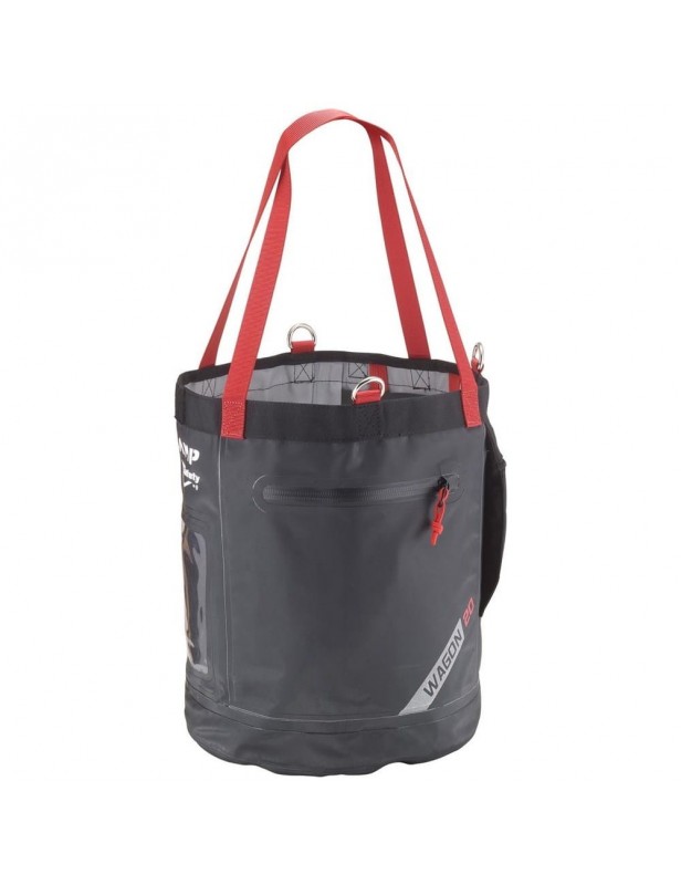 Wewnątrz znajdują się dodatkowe kieszenie ułatwiające organizację ładunku. W razie potrzeby, worek można wzbogacić dodatkowymi torbami na akcesoria \"Spacecraft Bag\" sprzedawanymi osobno. Do ich montażu służą szlufki na rancie wiadra. Na zewnątrz do dyspozycji są dwie kieszenie zamykane bryzgoszczelnym zamkiem. Jedna z nich posiada dodatkowe okienko na etykietę z imieniem lub opis zawartości. Wiadro CAMP Wagon dostępne jest w dwóch pojemnościach 10 i 20L.