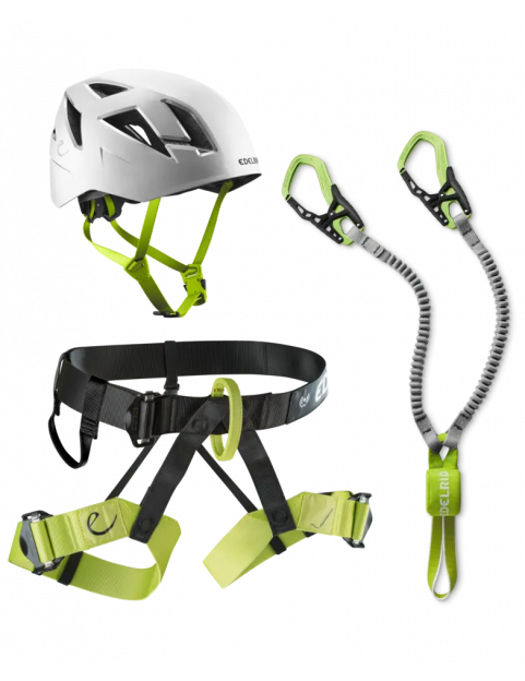 Wszechstronny zestaw do via ferraty zawierający uprząż wspinaczkową JOKER, sprawdzony zestaw do via ferraty CABLE KIT z odpornymi na zużycie, elastycznymi ramionami z taśmy oraz lekki i niezwykle stabilny kask hybrydowy ZODIAC.
