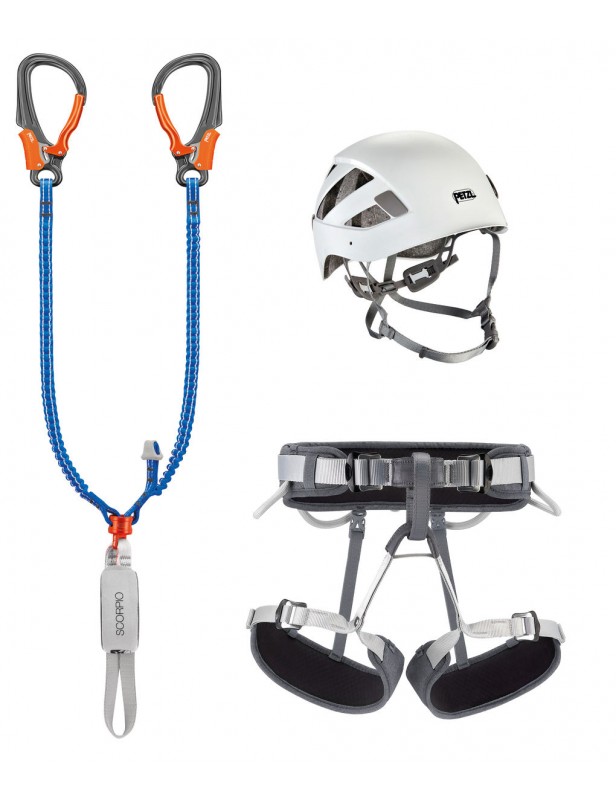 ZESTAW VIA FERRATA EASHOOK zawiera sprzęt odpowiedni na via ferrata: lonżę SCORPIO EASHOOK, regulowaną uprząż CORAX i kask BOREO w rozmiarze M/L.